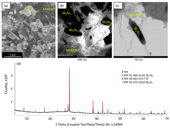 Such deposition is consistent with the previous reports on the growth of Sb2Te3 nanostructures on MWCNT surfaces and is related to the deposition mechanism [12]. The XRD pattern of the deposited Sb2Te3 nanostructures (Figure 1d) showed the presence of peaks characteristic for Sb2Te3 in a powder form (Figure 1d, red curve), indicating random orientation of the Sb2Te3 nanostructures. In addition, low-intensity diffraction peaks related to Sb2O3 (Figure 1d, blue curve) and Te (Figure 1d, green curve) were observed, indicating the presence of native oxide layer on the Sb2Te3 nanostructures, as well as possible inclusion of clusters of Te in the Sb2Te3-MWCNT heterostructures. These results are consistent with the previously reported for the MWCNT-Sb2Te3 heterostructures [13].