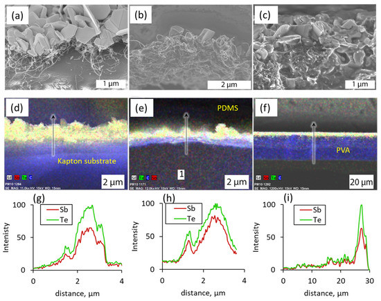 SEM images (a–c), EDS mapping (d–f) and EDS elemental line-scan profile (g–i) of the cross section of flexible films containing Sb2Te3-MWCNT heterostructures: (a,d,g) free standing on polyimide surface; (b,e,h) encapsulated in PDMS; and (c,f,i) mixed in PVA. Arrows in (d–f) represent the scanning direction.