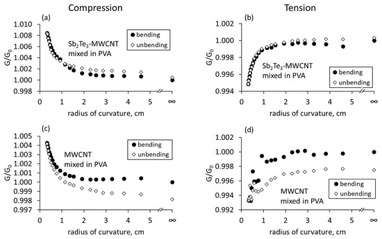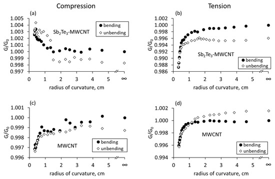 Relative changes in the electrical conductance of Sb2Te3-MWCNT heterostructures and bare MWCNT networks mixed in the PVA vs. its radius of curvature: (a,c) compressive stress; (b,d) tensile stress. G is the conductance of the bent flexible film, G0 is the conductance of the not bent flexible film.