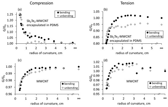 Relative changes in conductance of Sb2Te3-MWCNT heterostructures and bare MWCNT networks encapsulated in PDMS vs. its radius of curvature, while the side with higher Sb2Te3 concentration is subjected to compression (a,c) or tension (b,d). G is the conductance of the bent flexible film, G0 is the conductance of the not bent flexible film.