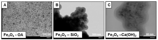 The morphology of magnetic dental composite materials (TEM images): (A) Fe3O4-OA, hydrophobic magnetic nanoparticles, covered with oleic acid; (B) Fe3O4-SiO2, magnetic composite, covered with SiO2 layer; (C), Fe3O4-Ca(OH)2, final magnetic dental composite material, covered with a layer of Ca(OH)2.