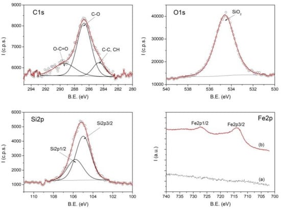 The spectrum of Si2p containing the doublet Si2p3/2 and Si2p1/2 from Figure 3 confirms the coating of nanoparticles with SiO2. Due to the coating of nanoparticles with SiO2, the Fe2p spectrum could be observed only after sputtering at 2000 V for 180 min with argon ions (spectrum (b) in Figure 3).