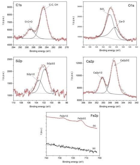 High-resolution XPS spectra of C1s, O1s, Si2p, Ca2p and Fe2p (spectrum (a) before sputtering; spectrum (b) after sputtering at 1500 V 60 min and 2000 V 180 min) from the sample Fe3O4-Ca(OH)2.