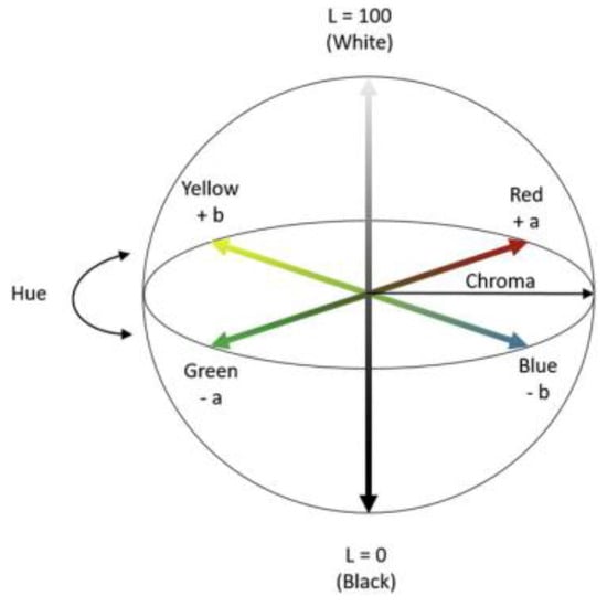 The CIELAB, or CIE L*a*b*, color system represents the quantitative relationship of colors on three axes: L* value indicates lightness, and a* and b* are chromaticity coordinates. On the color space diagram, L* is represented on a vertical axis with values from 0 (black) to 100 (white) []. The * value indicates red-green component of a color, where +a* (positive) and −a* (negative) indicate red and green values, respectively. The yellow and blue components are represented on the b* axis as +b* (positive) and −b* (negative) values, respectively. The center of the plane is neutral or achromatic. The distance from the central axis represents the chroma (C*), or saturation of the color. The angle on the chromaticity axes represents the hue (h°) [].