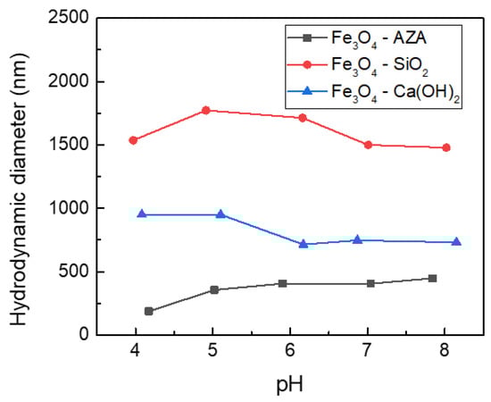It can be seen from Figure 6 that the hydrodynamic diameter of MNPs and inorganic coated magnetic composites increases compared to particle diameter values determined from TEM. It is known that the hydrodynamic diameter is always larger than the particle diameter, because it takes into account the interactions between the surface and the aqueous environment. In this study, the carboxylic groups of the hydrophilic MNPs (Fe3O4-AZA), the SiO2 and the Ca(OH)2 layers all are hydrophilic in nature, which can form hydrogen bonds with the water molecules of the medium, so a slight increase of the hydrodynamic diameter compared to the primary particle size obtained by TEM is normal. In our study, a more significant increase in hydrodynamic diameter was observed in all three cases, which can be attributed to the presence of the electric double layer, whose thickness is greatly influenced by the solution conditions (pH, salt concentration, etc.).