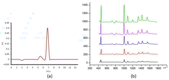 The uric acid peak of HPLC was eluted at 7 min (Figure 3a). Raman spectra are shown for the series dilution of filted uric acid with a mixture ratio of 1:19 (Figure 3b), exhibiting prominent peaks at 442, 712, 802, 1000, 1085, 1206, 1343, 1436 and 1560 cm−1.