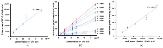 Figure 4a–c shows the analysis of the two sets of experimental data, along with the regression calculated from the area of the HPLC and the maximum intensity of peaks of SERs, against concentration. In each case, the data points were fitted resulting in a linear fitting curve indicated that a linear behavior can be found versus concentration in the range from 5 to 50 μg/mL. The area of the HPLC peak was seen to be linear in concentration, as shown in Figure 4a, and this linear fit can thus act as a calibration curve for the analysis of the uric acid content of the biofluids. There was a linear correlation, with R2 of 0.994, between the peak area of HPLC and maximum peak intensities at 1000 cm−1, as shown in Figure 4c. The high value of the correlation coefficient indicates a high degree of linearity of the calibration in Figure 4a.