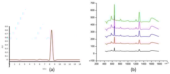 The hypoxanthine HPLC peak was eluted at 8.4 min, as shown in Figure 5a. The SERS spectra of the series dilution of hypoxanthine with nanostars are shown in Figure 5b. The prominent peaks appear at 560, 640, 803, 1206, 1290 and 1620 cm−1.