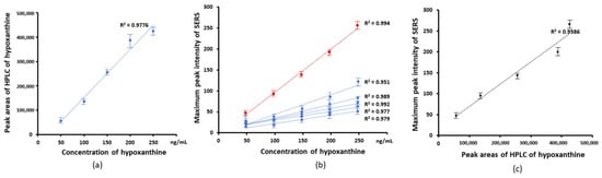 Figure 6 shows the analysis of the two sets of experimental data, along with the regression calculated from the area of HPLC, and the maximum intensity of SERS peaks against concentration. The high value of the correlation coefficient indicates a good linearity of the calibration of HPLC vs. concentration in Figure 6a, and this linear fit can thus act as a calibration curve for the analysis of the hypoxanthine content of the biofluids. For the SERS peaks, a linear behavior can be found when the peak intensities were plotted versus concentration over the range from 50 to 250 ng/mL (Figure 6b). The peak intensities at 640 cm−1 show the highest R2. There was a linear correlation between peak area of HPLC and SERS peaks intensities, as shown in Figure 6c for the case of 640 cm−1, with an R2 value of 0.959.
