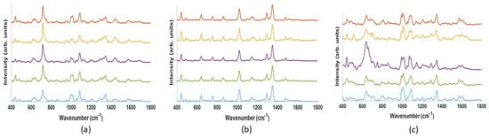 The SERS spectra of the 3 kDa filtrate of serum, saliva and urine with a nanostars mixture ratio of 1:19 are shown in Figure 7. In each case, the SERS spectra of five different samples showed a high degree of reproducibility, as shown in Figure 7.