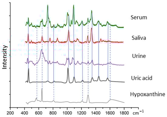 Overlap of spectra of 3 kDa filtrates of human serum, saliva and urine with uric acid and hypoxanthine. The intensity of peaks and highest overlap peak in body fluids and uric acid and hypoxanthine. The overlap peaks with uric acid in solid blue line. The overlap peaks with hypoxanthine in vertical dash blue line. The assignment of peaks is provided in Table 1.
