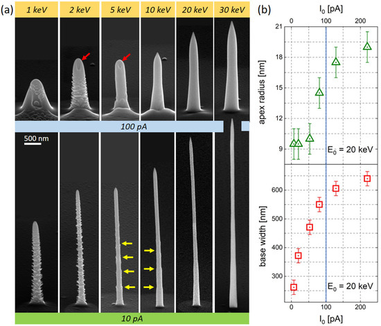 After determining the ideal α-pillar design, the impact of process parameters on overall morphologies was evaluated, which, for 3D-FEBID architectures, is a complex interplay of a multitude of effects [40,41]. Figure 2a gives a representative selection of Co3Fe α-pillars, deposited with the same design (; ; ), while the primary electron energies are varied (from left to right) for two different beam currents, of (upper row) and (lower row). While higher always leads to taller structures, higher results in shorter but clearly wider cones (upper row). Nominally, BB starts with 150 nm at the bottom, which is close to the found values for low currents (lower row). During further growth, vertical growth modes dominate over lateral widening, indicating a nicely balanced working regime [42]. While steps due to BB-reduction can be seen for and (yellow arrows), they smear out for higher energies, which can be explained by the increasing spatial distribution of forward scattered electrons (FSE). For decreasing , the dissociation probability increases, which reduces local coverages and, by extension, VGRs, as evident for both currents in Figure 2a (from right to left). For higher (upper row), base diameters are getting much wider and are found clearly beyond , as defined by the widest BBs, even when taking broader e-beams into account as well. In agreement with the arguments before, higher currents lead to stronger local depletion, which reduces vertical growth, while FSE-driven lateral growth becomes an essential part. This interpretation is further substantiated by the formation of indents (red arrows in Figure 2a) for and below, as theoretically predicted for such situations [42]. The FSE-driven lateral widening also prevents the clear identification of BB-steps, leading to smooth surfaces for and above. Figure 2b summarizes the current dependent evolution of α-pillar details, produced at and further used for MFM measurements presented below. As evident, the apex radii (triangles) are around for the lowest currents and increase to about for (blue vertical line), which is still much smaller compared to commercial products. Base widths start around for the lowest currents and then increase to about for , which clearly lies above the beam blur specified for the first bottom element.