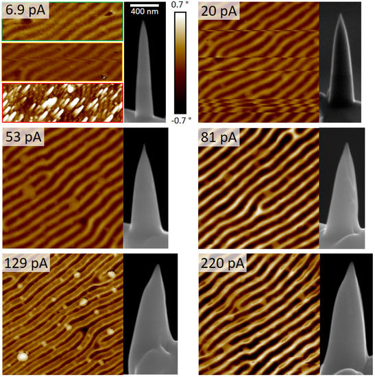 wide MFM phase maps of the CoPt multilayer sample, imaged with α-pillars of similar heights, fabricated at , while was varied from . For lowest currents, the MFM performance was very unstable, as shown by three representative images on the top left. The right SEM images show the respective Co3Fe probes; the scale bar of 6.9 pA applies to all.