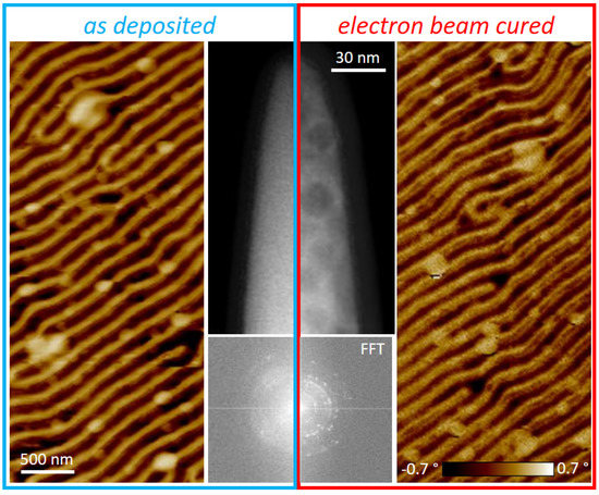 - Plank, H.; Kothleitner, G.; Hofer, F.; Michelitsch, S.G.; Gspan, C.; Hohenau, A.; Krenn, J. Optimization of postgrowth electron-beam curing for focused electron-beam-induced Pt deposits. J. Vac. Sci. Technol. B 2011, 29, 51801–51807. [Google Scholar] [CrossRef]