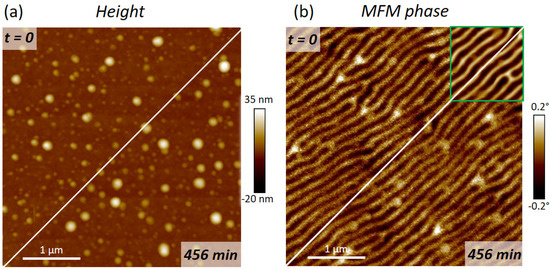 As aging effects on functional properties have been observed for some FEBID materials [16,62], we stored pre-tested α-pillars for one year in ambient conditions without direct light exposure. Although its structural composition was found to be very dense (Figure 5a), oxidation could not be a priori excluded and might degrade the magnetic functionality of Co3Fe α-pillars. Hence, MFM experiments were repeated after exactly 12 months with the very same AFM system and identical scan parameters on the same CoPt sample. Figure 9 compares two MFM phase images, which were acquired directly after fabrication (a) and after long-time storage (b). As is evident, they are practically identical in quality and resolution, with average phase shifts of 0.34° before and after storage, as shown by the histogram insets in Figure 9. This means a practical loss-free sensitivity after one year, which underlines the chemical stability of this outstanding precursor. This concluded the evaluation of Co3Fe α-pillars, which reveals not only excellent MFM performance but also high wear resistance and long-time stability, as relevant for commercial applications.