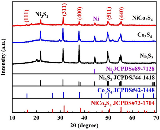 The powder products of Ni-S, Co-S, and NiCo-S growing on NF were dispersed into ethanol solution by ultrasound to eliminate the influence of NF on the XRD results of the samples. The sample powders were then tested and evaluated by XRD after vacuum at 60 °C overnight. The diffraction peaks are displayed in Figure 2. A comparison shows that the distinctive diffraction peaks of Ni-S, Co-S, and NiCo-S corresponded to Ni3S2 (JCPDS: 44-1418), Co3S4 (JCPDS: 42-1448), and NiCo2S4 (JCPDS: 73-1704), respectively, indicating that these are the crystalline phases of the prepared Ni-S, Co-S, and NiCo-S materials. The peaks at 21.8°, 31.1°, 37.8°, 44.4°, 49.7°, and 54.6° were defined as the (101), (110), (003), (202), (113), and (104) crystal planes of Ni3S2, respectively. The peaks at 31.1°, 37.8°, 49.9°, and 55.1° were the characteristic peaks of Co3S4, and they could be attributed to its (311), (400), (511), and (440) crystal planes, respectively. For NiCo2S4, diffraction peaks could be seen at 16.1°, 31.3°, 37.9°, 50.2°, and 55.1°, which could be defined as the characteristic peaks of (111), (311), (400), (511), and (440) crystal planes, respectively. NiCo-S had a lower diffraction peak intensity than Ni-S and Co-S under the same reaction circumstances, suggesting that the material was in a less crystalline form [35]. The peak of the three samples at 44.3° corresponded to Ni (JCPDS: 89-7128), which may be the mixed NF skeleton in the process of ultrasonic dispersion. Meanwhile, the Co-S sample without a Ni source could also produce a small amount of Ni3S2 (21.7°, JCPDS: 44-1418). The Ni3S2 core in this instance was assumed to have originated from the NF. Some vulcanization reactions took place in the foamed nickel of all samples during the vulcanization reaction [17]. Hong et al. [36] observed the characteristic peaks of NiCo-MOF (11.1°, 15.3°, and 23.6°), which was not shown in the XRD spectrum of the present study, indicating that all NiCo-MOF was transformed into NiCo-S. Overall, the NiCo-S/NF electrode material was successfully synthesized in this experiment.
