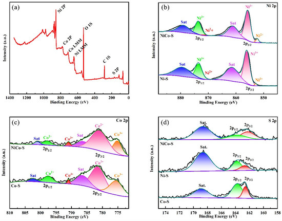 XPS measurements were performed to provide further insights into the chemical compositions and chemical valence states of the prepared samples. The XPS survey spectrum of NiCo-S/NF is shown in Figure 3a. Ni 2p, Co 2p, S 2p, and O 1s C 1s could be observed in the spectrum, indicating the presence of these elements in the sample. The C element could be seen in the spectrum of NiCo-S/NF due to the influence of the test environment. Meanwhile, the appearance of O 1s peak was affected by the use of organic ligands in the experiment. As shown in Figure 3b, Ni 2p contained two pairs of spin orbitals (Ni 2p1/2 and Ni 2p3/2) and two satellite peaks (“Sat.”). The binding energy at 860.09 eV in Ni 2p3/2 and 873.78 eV in Ni 2p1/2 could be ascribed to the Ni3+ states, while those located at 852.54 and 870.77 eV could be assigned to the Ni2+ states [17,37]. Meanwhile, the accompanied weak peaks at 861.72 and 879.62 eV belonged to two satellite peaks (“Sat.”). These findings proved that the Ni atoms in NiCo-S had two different valence states, indicating the existence of Ni3+ and Ni2+. Similarly, in Figure 3c, the diffraction peaks at 781.6 and 797.55 eV could be assigned to Co2+, and the binding energies of the two satellite peaks were located at 787.88 and 803.38 eV. The peak values of Co3+ were located at 791.58 and 777.62 eV. The two pairs of diffraction peaks and satellite peaks indicated two different valence states of Co atoms in NiCo-S, Co2+, and Co3+, respectively [38]. In Figure 3d, the peaks at 163.8 and 162.27 eV in the S 2p spectra could be attributed to S 2p1/2 and S 2p3/2, respectively, indicating that the S atom in the sample material was S2− [28]. Meanwhile, another peak at 168.65 eV could be assigned to the high-valence oxidation peaks of surface sulfur pieces. As described above, the XPS results further confirmed that NiCo-S consisted of Ni, Co, S, and O elements, and multiple valence states existed in the elements (Ni2+, Ni3+, Co2+, Co3+, and S2−), consistent with the related literature on NiCo-S/NF electrodes [35,39].
