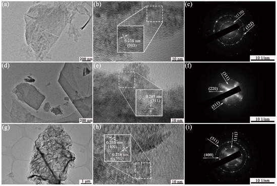 Figure 5. TEM, HRTEM, and SAED of the prepared samples: (ac) Ni-S/NF; (df) Co-S/NF; (gi) NiCo-S/NF.