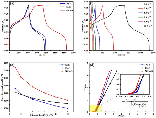 Figure 7. (a) GCD curves at 1 A∙g−1 of different electrodes. (b) GCD curves at different current densities of the NiCo-S electrode. (c) Variation in specific capacitance of all electrodes with different current densities. (d) EIS of all electrodes.