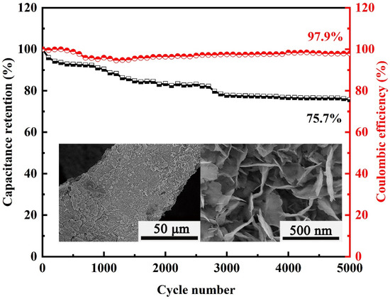 The electrochemical stability of electrode materials is also one of the key parameters to evaluate the performance of supercapacitors. The Coulomb efficiency of NiCo-S/NF remained at 97.9%, indicating that the electrode material had a highly reversible Faraday redox reaction [50]. The cycling experiment under 50 mV∙s−1 at the voltage window ranging from −0.2 to 0.6 V further displayed that NiCo-S/NF presented good electrochemical stability, as shown in Figure 8. The attenuation was around 23% in the first 3000 cycles. The main reason is that during the prolonged redox reaction process, the electrode material continuously contracts and expands, which causes a little exfoliation of the active material from the collector [51]. Simultaneously, throughout the lengthy cycle, some nanoarrays partially collapsed, which slows down OH diffusion and lowers the specific capacity [52]. The NiCo-S/NF SC remained at 75.7% of the initial SC after 5000 cycles. Compared with those in other studies in the literature (Table 3), the NiCo-S/NF electrode demonstrated good cycling stability. The SEM image of the electrode material after 5000 cycles showed that the NiCo-S nanosheet array nearly retained its original morphology. The SEM image of NiCo-S/NF after 5000 cycles was shown in the inset of Figure 8. Compared with Figure 4g,i, the electrode material falls off from NF and the nanosheet roughness increases after cycling, which further explains the stable reduction of cycling of the electrode material.