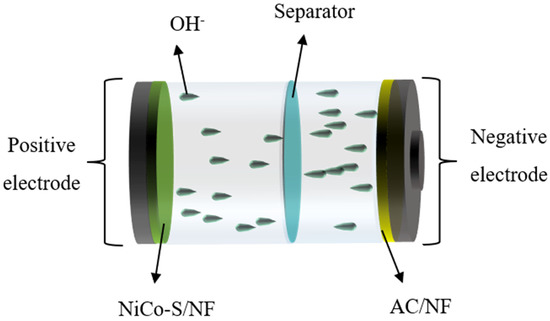 The above results indicated that NiCo-S/NF showed excellent electrochemical performance. A NiCo-S/NF//AC HSC device was constructed to further display the real application of the NiCo-S/NF material. Figure 9 is the simplified scheme of the HSC device in 6 M KOH, in which the synthesized NiCo-S/NF//AC material was used as the positive electrode. Meanwhile, the AC/NF electrode served as the negative electrode owing to its high specific surface and excellent electrical conductivity. A filter paper was used as a diaphragm in the middle. In the process of preparing the two-electrode device, the required AC mass (excluding the NF load) was calculated using Formulas (3) and (4) so that the two-electrode device could exhibit excellent performance. A reasonable mass ratio of positive and negative active materials could ensure compliance with the law of charge conservation in the electrochemical reaction process and further enhance the performance of the materials.