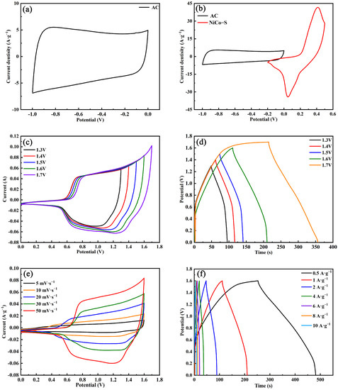 Figure 10. (a) CV curves of AC in a three-electrode system at a scan rate of 50 mV·s−1. (b) CV curves of NiCo-S and AC electrodes at a scan rate of 50 mV·s−1. (c) CV curves of HSC device at 50 mV·s−1 with different potential windows. (d) GCD curves of HSC device at 1 A·g−1 with different potential windows. (e) CV curves of HSC devices with various scan rates. (f) GCD curves of HSC device at different current densities.