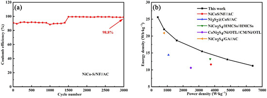 Figure 11. (a) Coulomb efficiency of NiCo-S/NF//AC HSC at a scan rate of 50 mV·s−1 after 3000 cycles. (b) Ragone plot of assembled NiCo-S/NF//AC HSC to compare the performances of other supercapacitors.