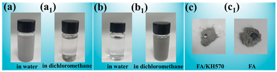 For the sake of proving the dispersibility of the FA@KH570 microparticles, unmodified FA and FA@KH570 microparticles were dispersed in dichloromethane solution and deionized water under ultrasonication, respectively (Figure 2). After standing for 2 h, it was clearly seen that FA microparticles were in a turbid state in the water (Figure 2a), which was the proof that FA microparticles were dispersed well in the water. However, most of FA microparticles were deposited at the bottom in dichloromethane due to the poor dispersibility and high density (Figure 2a1). FA@KH570 microparticles showed the opposite state: FA@KH570 floated on the surface in aqueous dispersion due to its hydrophobicity (Figure 2b); FA@KH570 was uniformly dispersed in dichloromethane, indicating the excellent compatibility of FA@KH570 with dichloromethane (Figure 2b1). From the optical image in Figure 2c, the water droplet would directly penetrate into FA microparticles, further illustrating the hydrophilicity of FA. On the contrary, FA@KH570 repelled the water droplet, owing to the grafting of long-chain alkanes (Figure 2c1).