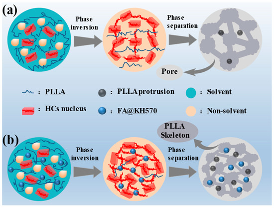 Mechanism diagram of the growth of hierarchical structures for (a) pure PLLA and (b) PLLA/FA@KH570 composites.