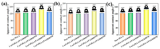 (a) Contact angles of neat PLLA and PLLA/FA@KH570 composites. (b) Contact angles of neat PLLA and PLLA/FA@KH570 composites with candle grease coating. (c) Contact angles of neat PLLA and PLLA/FA@KH570 composites after abrasion.
