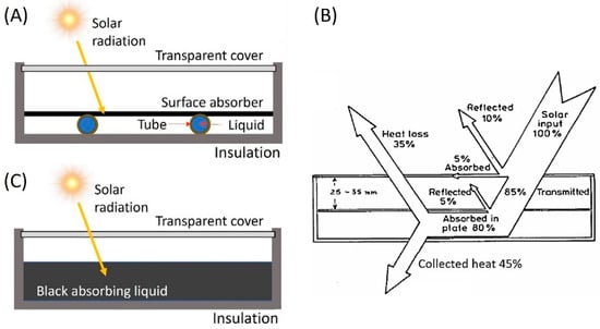 (A) Surface-based absorption solar collector with (B) the flow of both heat and solar light in a typical liquid flat plate collector. (C) Direct (volume-based) absorption solar collector (DASC). Reproduced with permission from [19].