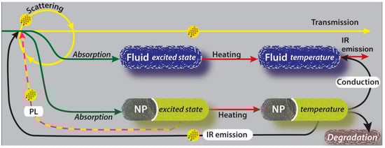 Light interaction with an NF can give rise to several physical and chemical phenomena (Figure 3), establishing a flow pattern for the energy originating from solar photons. Here we consider phenomena taking place within the NF, as interface interactions such as reflection, etc., at the front- and back-end of the NF can be discussed under textbook optics. The extent of energy exchange and the mechanisms involved strongly depends on the material characteristics of the NP in the NFs [91,92,93,94,95,96] as well as the size/shape of the NPs and their concentration in the NF. With reference to Figure 3, heating of the working fluid, hence its temperature increase, is ultimately the desired ‘finish-line’ for the energy flow. Note that the temperature of the NPs may not be at equilibrium with the fluid temperature under solar irradiation, hence the NPs and the working fluid should be considered separately.
