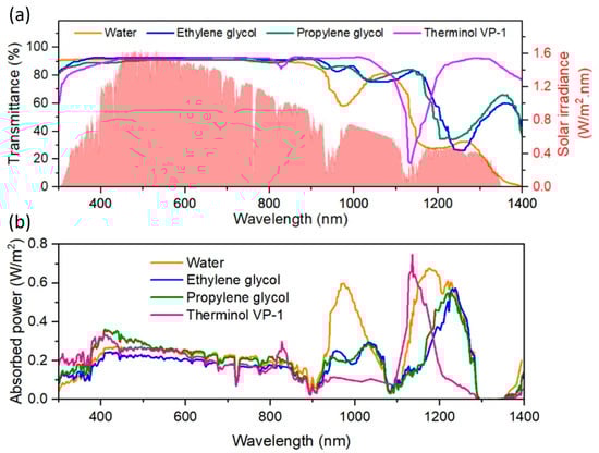 (a) Spectral solar irradiance at Earth’s level (air mass of 1.5, AM1.5) [102] and (b) transmittance of common base fluids used in DASCs for a one cm sample thickness (transmittance for Terminol VP-1 is taken from [29]).