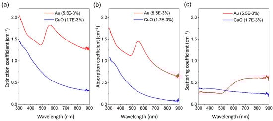 This approach was used, for instance, to evaluate the properties of surfactant-free Au NPs prepared by McGlynn et al. [61], which exhibited a variety of shapes and sizes, with most particles consisting of small spherical NPs with an average diameter of 27 nm. They evaluated the absorption and scattering behaviours of their NF (Au NPs in ethylene glycol) across the wavelength range of 300–900 nm, and the results revealed that both absorption and scattering coefficients increased with the NP concentrations, as expected. In addition, the absorption coefficient is dominated by the plasmonic absorption between 540 nm and 560 nm (red in Figure 6b), which is much higher than the corresponding scattering coefficient (red in Figure 6c) for most of the spectral range.