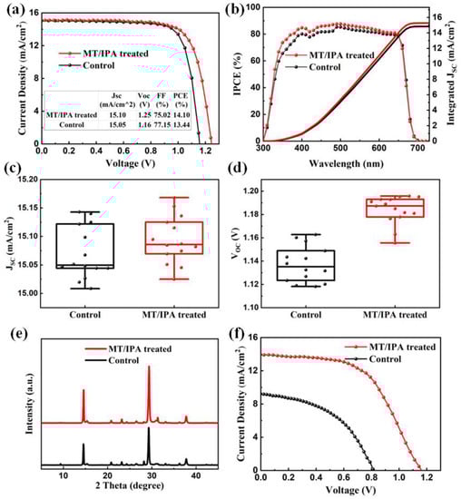- Mao, P.; Zhou, Q.; Jin, Z.; Li, H.; Wang, J. Efficiency-Enhanced Planar Perovskite Solar Cells via an Isopropanol/Ethanol Mixed Solvent Process. ACS Appl. Mater. Interfaces 2016, 8, 23837–23843. [Google Scholar] [CrossRef]