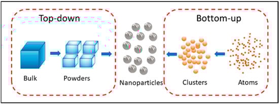 Top-down and bottom-up approaches in the synthesis of NPs []. Reprinted from an open-access source.