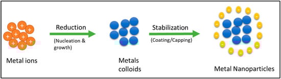 The bottom-up synthesis of NPs requires the presence of reducing and capping agents for proper control over the final properties of the nanomaterial. According to Indumathy et al. [], metal colloids are formed through the reduction of metal ions in two stages: nucleation and growth, and the relative rate of these two stages determines the size distribution of the colloids. The concentration of the reducing and capping agents can influence these processes, and the use of capping agents is crucial in ensuring the stability of the NPs by preventing aggregation through the creation of electrostatic, steric, or electrosteric interactions between the particles. The formation of NPs is shown in Figure 2. It is important to note that the interaction between metal precursor ions and reducing agents and the interface between the capping agents and metal NPs can have a significant impact on the morphology and physicochemical properties of the metal NPs [,,].