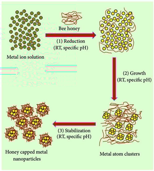 Schematic diagram of honey-mediated green synthesis of NPs []. Reprinted from an open-access source.