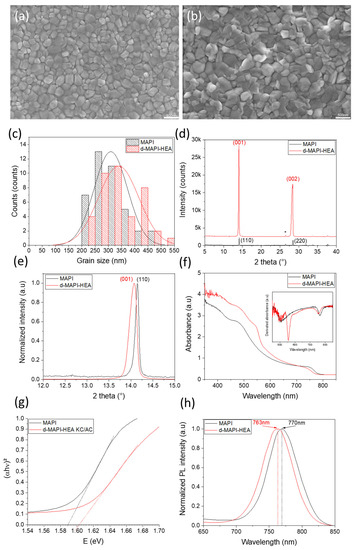 Top-view SEM images of (a) MAPI film and (b) d-MAPI-HEA film (Scale bar: 500 nm). (c) Grain size distribution in MAPI and d-MAPI-HEA films. (d) XRD patterns of MAPI and d-MAPI-HEA films (FTO peaks are indicated by the * symbol) (e) Same as (d), normalized and zoomed on (110) peak. (f) UV-Visible absorbance spectra (inset represents the derivative absorbances), (g) Tauc Plot, and (h) Steady-State PL of MAPI and d-MAPI-HEA perovskite films (λexc = 510 nm).