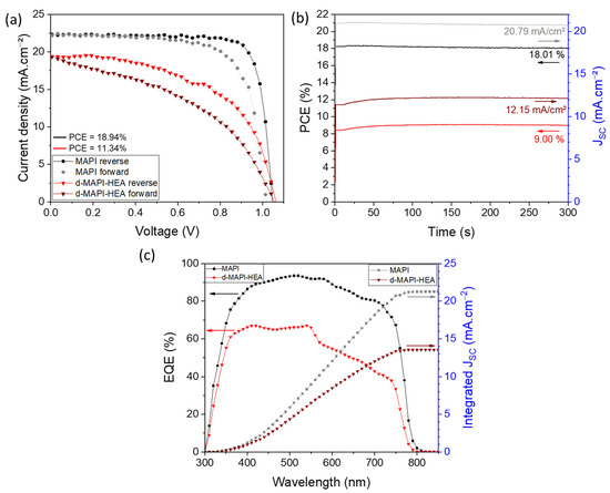 (a) J-V curves of best MAPI and d-MAPI-HEA devices. (b) Stabilized efficiency of best MAPI and d-MAPI-HEA devices (the applied voltages are 0.87 V and 0.74 V, respectively). (c) EQE spectra (left) with integrated JSC (right) of best MAPI and d-MAPI-HEA devices. The arrows point out the Y-axis to read.