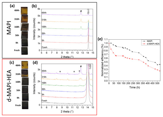 (a) Pictures of MAPI unencapsulated films upon aging. (b) XRD patterns upon the stability test of MAPI. (c) Pictures and (d) XRD patterns zoomed between 5° and 15° from the stability test of the unencapsulated d-MAPI-HEA films. FTO peaks are indicated by the ¤ symbol. # Indicates PbI2. ¤ symbol indicates unknown phases. (e) Evolution of normalized efficiency of unencapsulated MAPI and d-MAPI-HEA devices as a function of aging time. Storage upon aging tests was made in air under ambient conditions (50–70% RH; T° = 15–20 °C) and ambient light.