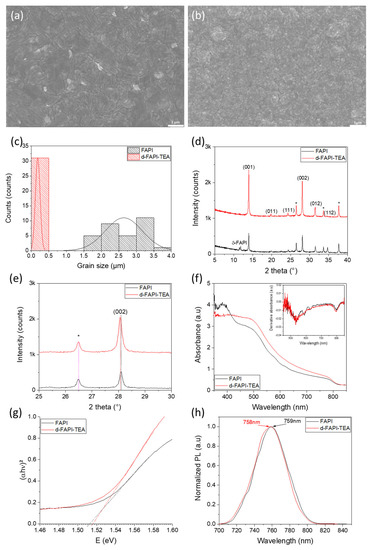 FAPI and d-FAPI-TEA samples were prepared as powder adducts washed with diethyl ether before being dried. Their differential Scanning Calorimetry (DSC) curves are shown in Figure S10. The FAPI curve displays endothermic peaks at 70–90 °C, 101.5 °C, and a large one with a minimum at 153.5 °C assigned to the crystallization of the black perovskite α-phase [85,86]. For d-FAPI-TEA perovskite, prepared with a DMF/NMP mixture with a volume ratio of 80/20, the shape is clearly different with a first broad peak observed at 50.9 °C and three others at 80.2 °C, 93.6 °C and 105.6 °C. In this case, the starting material contains the black perovskite α-phase. The two very different calorimetric behavior highlights that the two materials are different in nature. Scanning electron microscopy (SEM) was performed to assess the morphology of optimized d-FAPI-TEA perovskite and to compare it to its classic FAPbI3 counterpart. On top views (Figure 5a,b), both layers are covered and pinhole-free. FAPI film is made of highly textured micrometer-sized grains with PbI2 flakes (bright grains) dispersed throughout the surface. However, higher magnification images (Figure S11) show that the micrometer-sized grains seem to be polycrystalline, i.e., constituted of smaller grains. Unfortunately, these smaller grains are difficult to distinguish, so it is impossible to determine their size. On the other hand, d-FAPI-TEA film presents small grains around 200 nm in size (Figure 5c) without a trace of PbI2. Cross-sectional views of the films are shown in Figure S12. The two perovskites present completely different morphology. For the FAPI layer, we confirm the presence of large grains while no pinholes nor voids are present. The surface is not smooth. On the other hand, d-FAPI-TEA is made of smaller grains throughout its thickness which is detrimental for charge transport due to an increased number of grain boundaries. Moreover, voids could be observed near the ETL/PVK interface on this layer, which must greatly hinder the final efficiency of the complete devices. To complement the study of the morphology, we performed XRD measurements. Figure 5d shows the XRD pattern of the films. The addition of TEA+ increases the diffraction peak intensity of the film without changing its preferential orientation along the (001) and (002) plans. Higher peak intensity in the presence of TEA+ insertion is surprising in view of the poor morphological quality and small grains of these layers. Such a difference in crystallinity between FAPI and d-FAPI-TEA could also be caused by the not pure reference FAPI film (presence of yellow δ-FAPI phase) that hinders its crystallinity and then reduces the intensity of the peaks measured for this perovskite. Another noteworthy point is the total absence of δ-FAPI in the d-FAPI-TEA film, which is annealed at only 125 °C. On the other hand, FAPI films, annealed at 153 °C, present the δ-FAPI phase. Similarly to d-MAPI-HEA, d-FAPI-TEA exhibits a small shift of the (002) peaks to smaller 2θ values (Figure 5e), which is assigned to the good insertion of TEA+ cations within the FAPI perovskite lattice. The shift is yet less important because a smaller amount was employed for TEA+ compared to HEA+, mentioned earlier in the article. The total absence of peaks below 10° (Figure S13) is expected for the formation of pure-3D perovskite after small TEA+ incorporation. The UV-Visible absorbance spectra of the perovskite layers were measured (Figure 5f). d-FAPI-TEA displays a slightly better absorbance between 350 and 700 nm. By looking at the derivative absorbance, no additional peaks are observed for d-FAPI-TEA, which proves the obtaining of pure material with no undesired phases within the layer. On the other hand, the FAPI film presents several waves on its absorbance between 550 nm and 700 nm and the corresponding small peaks on its derivative absorbance spectrum. They can be assigned to the presence of impurity phases, such as yellow δ-FAPI detected by XRD measurements (Figure 5e) and interference fringes. Tauc plots were drawn to determine the optical bandgap value (Eg) and see its evolution after TEA+ cation incorporation within the FAPbI3 lattice (Figure 5g). An increase of 6 meV in the bandgap was noticed for d-FAPI-TEA compared to FAPI, which is in agreement with the lattice expansion caused by the TEA+ insertion observed by XRD. Steady-state photoluminescence characterizations were conducted to complete UV-Visible measurements (Figure 5h). A small shift of 1 nm of the PL peak was observed after TEA+ incorporation (from 759 to 758 nm), surely due to the small amount inserted (4%).