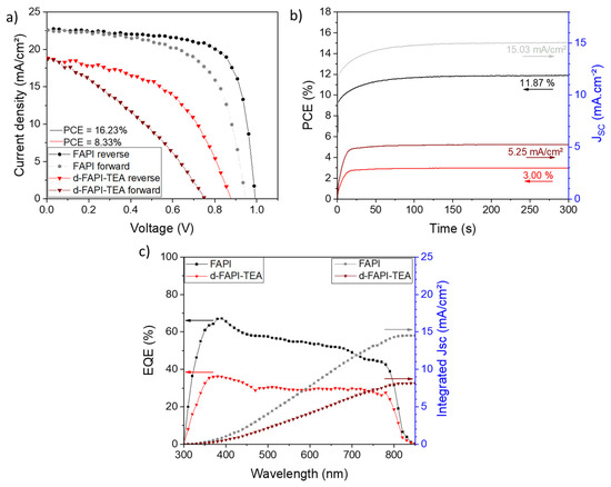 Ten complete devices were fabricated for each system, and their J-V curves were measured. On the one hand, FAPI delivered a maximum PCE of 16.23% (13.33% in forward scan), with a VOC = 0.99 V, JSC = 22.63 mA.cm−2, and FF = 72.40% when measured in the reverse scan, and a hysteresis of 17.9% (Table S5). Such efficiencies are in line with what can be found in the literature [76,80]. The hysteresis is comparable to the one we obtained for reference MAPI devices (Table S2) and is expected for simple perovskite without particular additives or post-treatment. On the other hand, d-FAPI-TEA delivered a maximum efficiency of 8.33% (4.71% in forward scan), with a VOC = 0.88 V, JSC = 18.68 mA.cm−2, and FF = 50.79% when measured in the reverse scan, and a hysteresis of 43.4% (Table S5). J-V curves of these cells are shown in Figure 6a. Data from reverse and forward scans are displayed in Table 2, and the corresponding box charts of both systems are shown in Figure S14. Stabilized efficiency of the best cells was measured (Figure 6g). Abnormally low efficiencies of 11.87% and 3.00% were obtained for FAPI and d-FAPI-TEA devices, respectively. EQE measurements were also conducted (Figure 6h) to understand these results. Spectra below our expectations were obtained. Indeed, for both systems, a low EQE curve with highly underestimated integrated JSC was found. The low values obtained for FAPI could be explained by its extremely poor stability, making the measured PSCs already slightly deteriorated between the J-V curves, the stabilized efficiency, and EQE measurements. Concerning d-FAPI-TEA, we can suppose that it is caused by the ionic migration and the presence of voids that is deleterious for charge transfer.