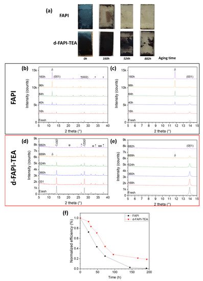 Finally, we conducted stability tests on perovskite films and complete cells by storing them in ambient air (RH = 50–70%; T° = 15–20 °C). Figure 7a shows pictures of FAPI and d-FAPI-TEA films upon aging. Figure 7b,c depicts the XRD patterns over a large 2θ range (left panels) and zoomed between 5° and 15° (right panels) for FAPI and d-FAPI-TEA films, respectively. The XRD study shows that the transformation of α-FAPI to yellow δ-FAPI phase started after 16 h for FAPI and that it continued until the total disappearance of black α-FAPI after 160 h (in accordance with Figure 7a). This result is consistent with the low stability observed for FAPI cells. Concerning d-FAPI-TEA films, after 331 h, the film was not deteriorated, which makes d-FAPI-TEA perovskite film much more stable than the FAPI one. The intensity of the (001) peak started to decrease slightly after 360 h. Once 524 h (22 days) passed, degradation of α-d-FAPI-TEA into δ-d-FAPI-TEA began. After 669 h, the (001) perovskite peak was greatly reduced, but the δ-d-FAPI-TEA peak did not increase in intensity, while new peaks appeared at 20.5°, 32.4°, 35.6° and 36.2° (Figure 7c), that we assign to Pb(OH)I phase formation, resulting in a pale white appearance of the film. [87] This compound, formed after the inclusion of hydroxide anions within the structure after a reaction between the perovskite and the humidity, was not observed for classic FAPI. After 882 h, no more δ-d-FAPI-TEA was present in the film and only a small amount of α-d-FAPI-TEA and Pb(OH)I was left. Not only the incorporation of TEA+ within FAPI perovskite improved the stability of the film greatly, as can be seen in Figure 7a, but it also changed its degradation pathway by converting α-compound into Pb(OH)I.