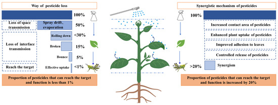 Schematic diagram of pathways of pesticide loss and synergistic approaches to improving pesticide utilization. The left figure represents the path of pesticide loss, and the right figure represents the synergistic mechanism of pesticides. The percentages in the figure (e.g., 100%, 50%, etc.) represent the utilization rate of pesticides.