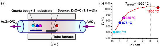 Schematic representation of the tube furnace system (a) and the corresponding temperature profile during the ZnO growth (b). The sample positions are mapped to their respective process temperatures by the colored indicators. The source is located at x = 0 cm and consists of a 1:1 mixture (weight) of ZnO and graphite powder.