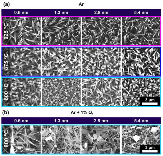As the ZnO-growth process is highly dependent on the complex combination of process parameters, e.g., system geometry (tube diameter) [21], temperature (T) [14], gas composition [15], and flow [15,22], pressure [21], type of substrate [23] and catalyst [12], the morphology expressions depend on the growth-setup. To differentiate between effects concerning the ZnO growth induced by the process parameters and those from laser irradiation of the catalytic gold thin film, ZnO-nanostructures were generated on unirradiated Au thin films with different layer heights (0.6–5.4 nm). Details about the thermal chemical vapor deposition (t-CVD) process are explained in detail in the Section 2. Figure 2a shows ZnO-nanostructures generated in a pure Ar–atmosphere (p = 12 mbar) at different temperatures T (hence different distances to the Zn-source, growth time t = 10 min). ZnO growth in pure Ar-atmosphere results in ZnO-nanorods (NRs) for all examined temperatures and gold layer heights. Analogue SEM micrographs for T = 1000 °C (upstream) are illustrated in the SI (Figure S3). The width and length of the NRs are dependent on the growth temperature. Lower temperatures lead to thicker, but shorter, NRs. Upon introducing 1% O2 to the carrier gas, a mixture of different morphologies consisting of thin nanowires (NWs) and narrow nanobelts (NBs) are obtained at T = 800 °C (Figure 2b). The colors in Figure 2 match the temperatures and sample positions illustrated in Figure 1.