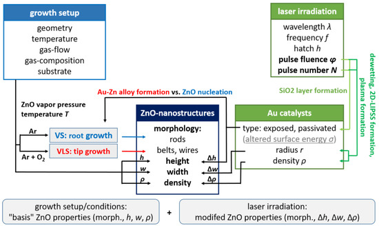 Schematic representation of the spatial-selective laser irradiation’s effect on ZnO nanostructure growth as compared to the growth setup and conditions. Note that additional cross-relations, which are of less importance and thus not illustrated, may occur.