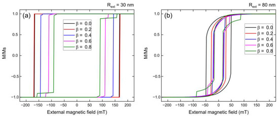 Hysteresis curves for 1000 nm long Fe3O4 nanotubes with external radius: (a) Rext = 30 nm and (b) Rext = 80 nm, for different β values, when the external magnetic field is applied along the z-axis.