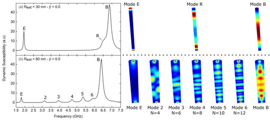 To investigate the magnetization dynamics of 1000 nm long Fe3O4 nanotubes, we carried out ferromagnetic resonance (FMR) studies on the remanent state of each geometry (see Figure A4 in Appendix A). Subsequently, we investigated the dynamic susceptibility of nanotubes with an external radius of 30 and 80 nm by applying a sinc wave excitation in the y-direction. Figure 4a shows the resonant modes for the nanowire (β = 0.0) with an external radius of 30 nm. We can observe two well-defined modes, one of low frequency mode edge (mode E), associated with the caps of the nanowire, and another of high frequency mode bulk (mode B), of greater height, as it excites a larger number of magnetic moments associated with the central area of the nanowire. The latter presents a small bump that we have defined as the mode ring (mode R), which is associated with a disturbance close to the edges of the wire. On the other hand, Figure 4b shows the resonant modes for the nanowire (β = 0.0) with an external radius of 80 nm. In this case, we can see that the number of modes increases, where seven modes are clearly identified, and among which we can again highlight the low frequency mode, mode E, and the high frequency mode, mode B. In this last mode, the bump we called mode R does not appear, but we can observe a similar behavior in mode 6. The increase in the number of modes that occurs when we go from a thin nanotube to a thick one is expected. Lupo et al. [61] investigated the radial and azimuthal resonance modes of spin waves in Ni80Fe20 (permalloy) nanodisks in the absence of an external magnetic field, finding that the number of absorption modes increased as the disk diameter increased. A similar conclusion was reached by Dobrovolskiy et al. [62], who investigated Co-Fe nanodisks. In fact, we have shown in Figure A5 of Appendix A that the number of resonance modes increases as the diameter of the nanotubes increases. It is evident from the FFT power distributions that each mode can be characterized by the number of nodes (N) present along the longitudinal axis of the nanotube [63].